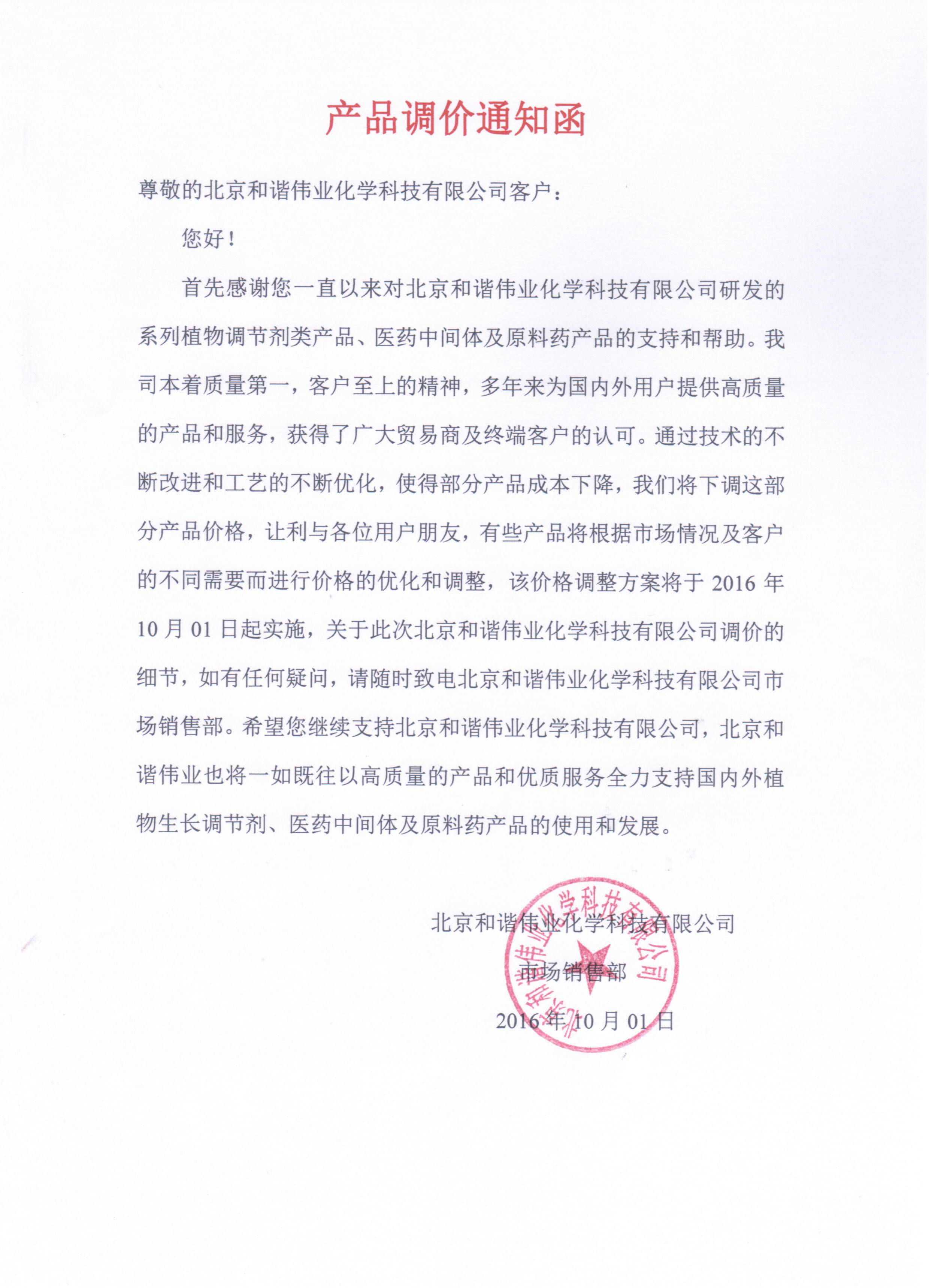 北京和谐伟业化学科技有限公司产品调价通知函